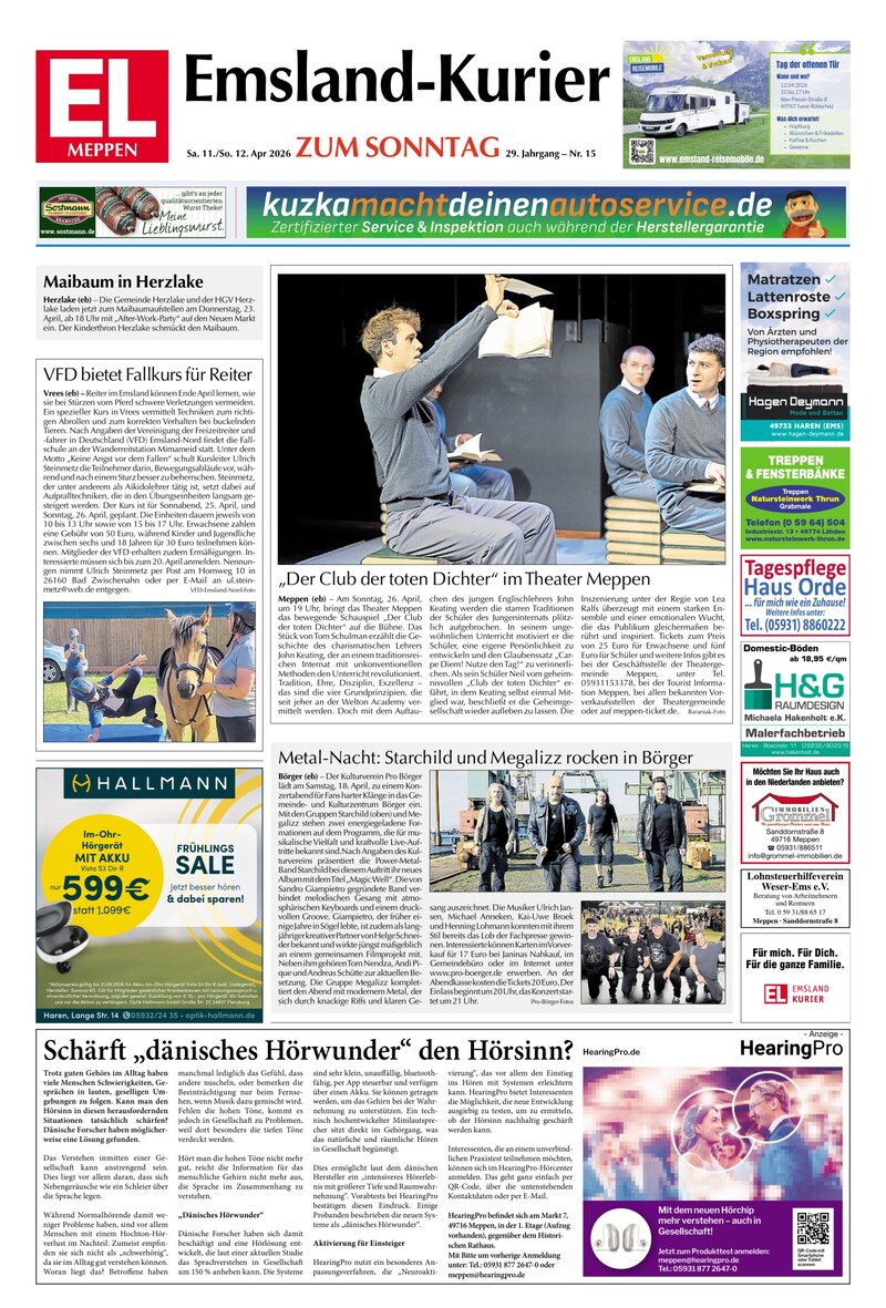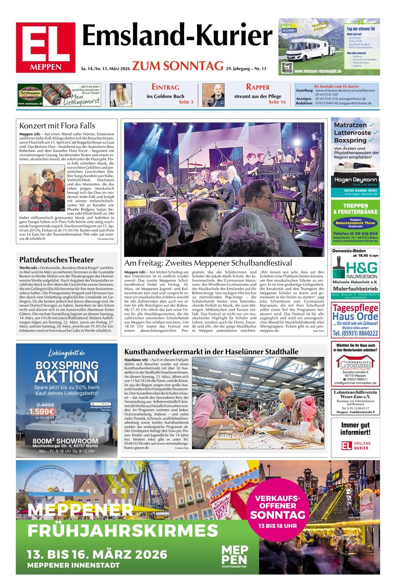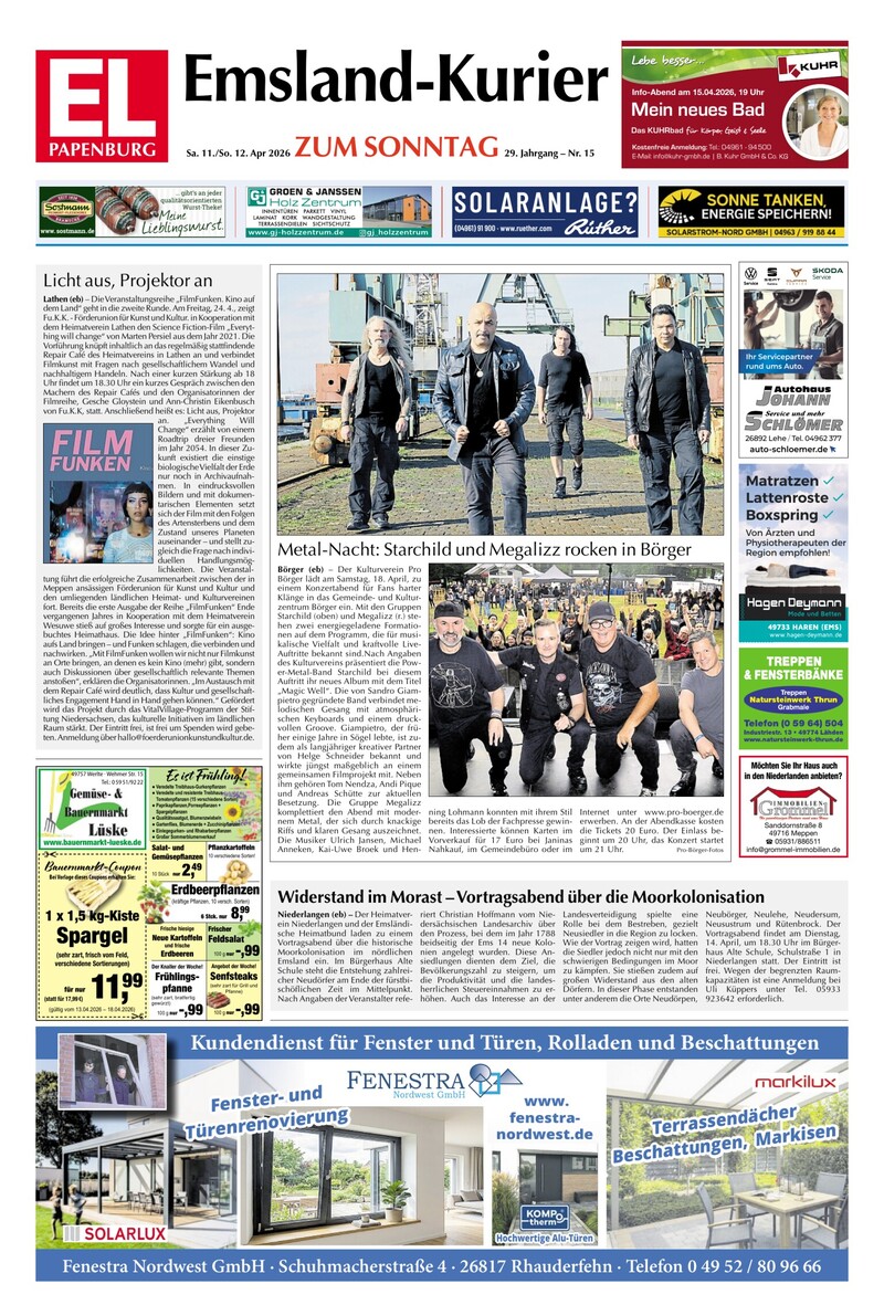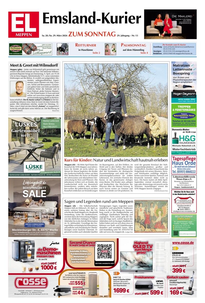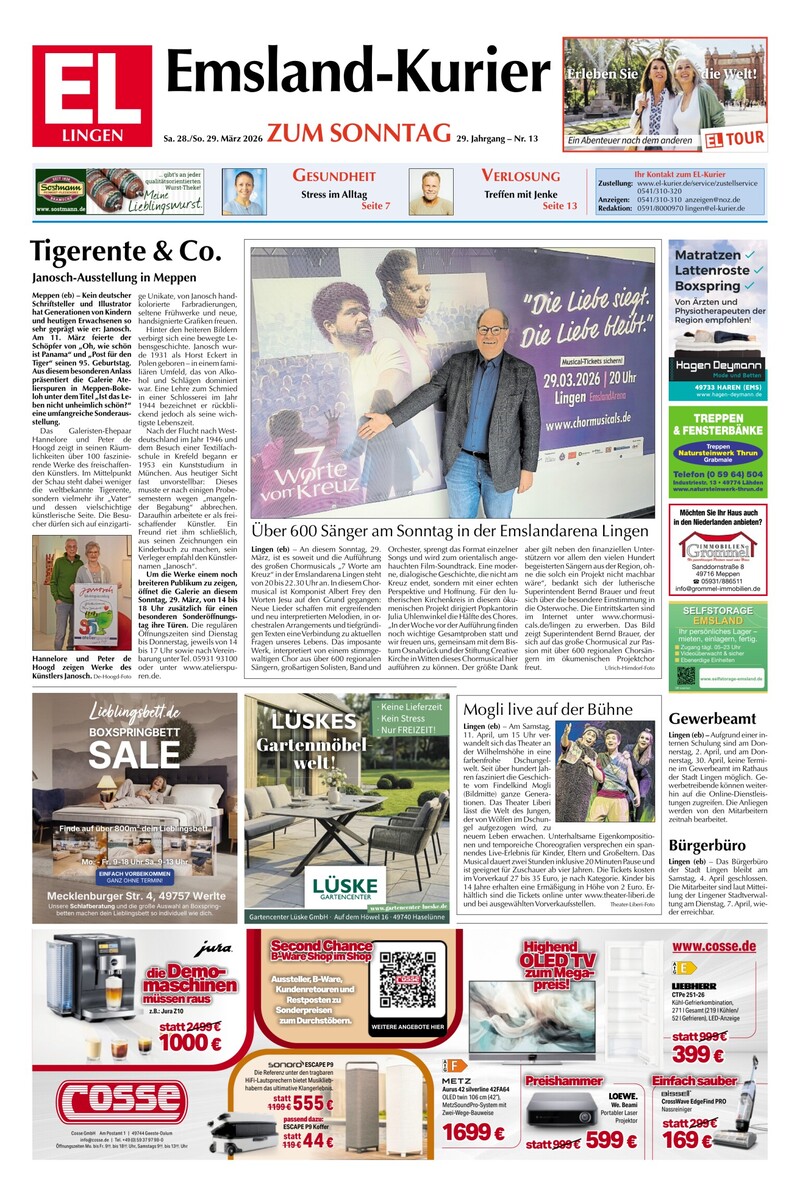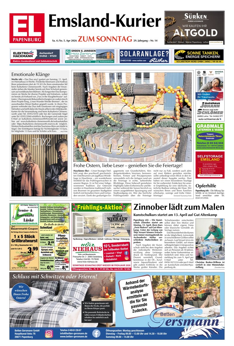 Aktuelle Ausgabe hier online lesen Emsland-Kurier Lingen 11.04.2026 Emsland-Kurier - Meppen 11.04.2026 Emsland-Kurier Papenburg 11.04.2026 Aktuelle Prospekte und Beilagen