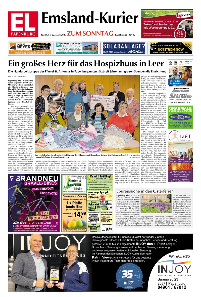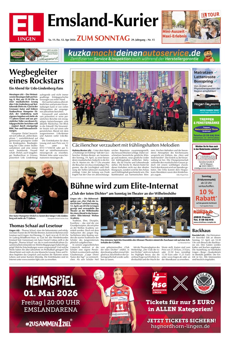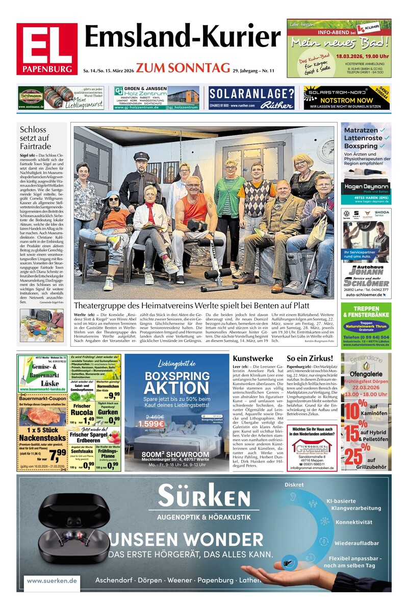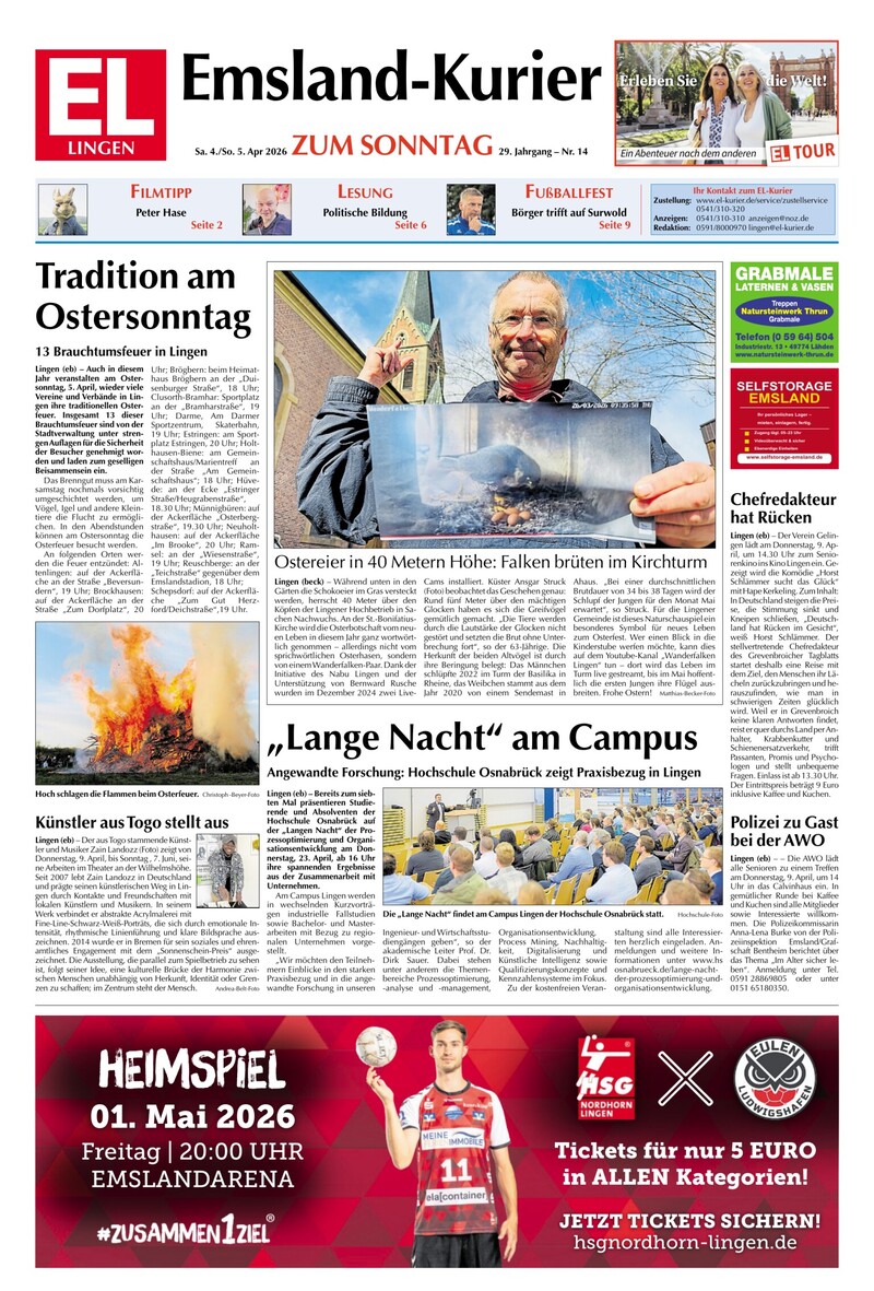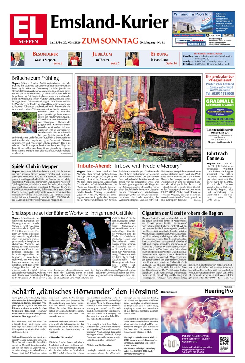Aktuelle Ausgabe hier online lesen Emsland-Kurier Lingen 11.04.2026 Emsland-Kurier - Meppen 11.04.2026 Emsland-Kurier Papenburg 11.04.2026 Aktuelle Prospekte und Beilagen