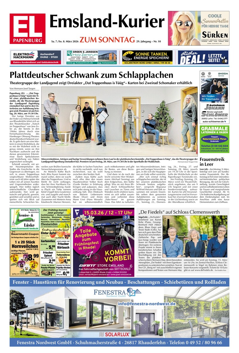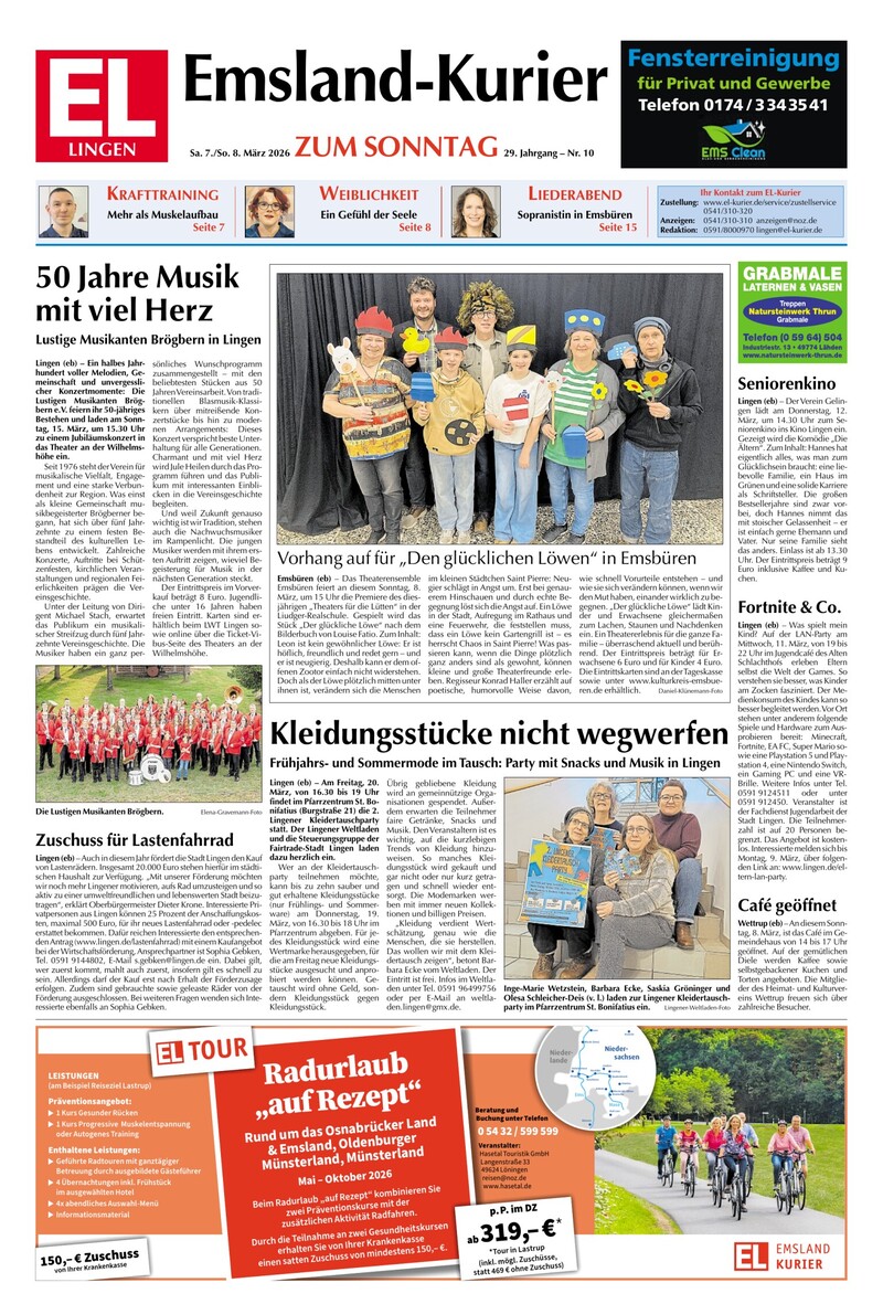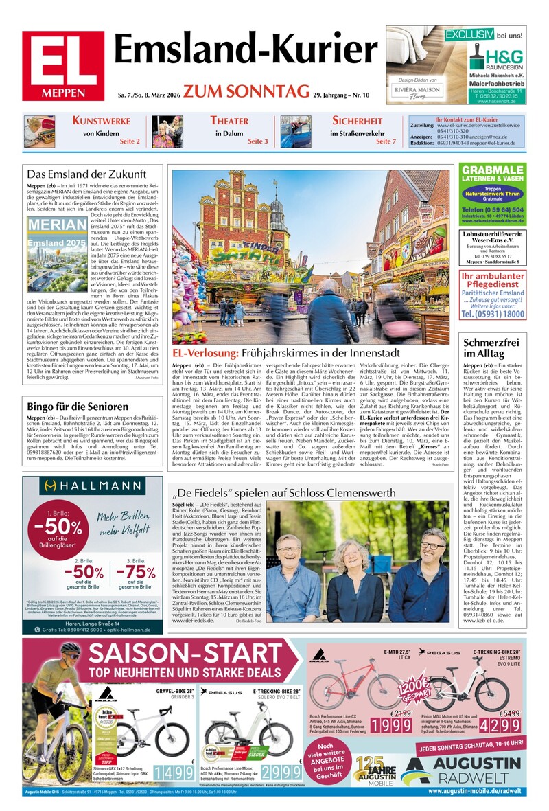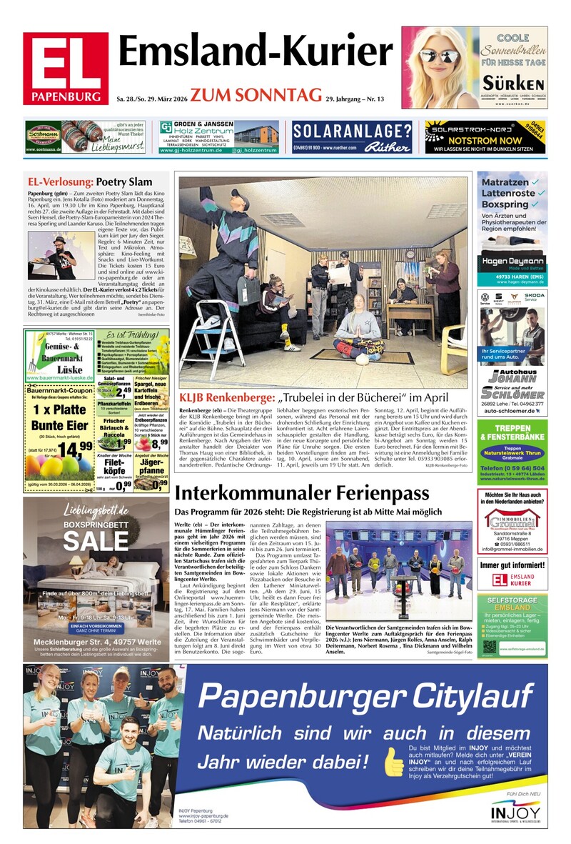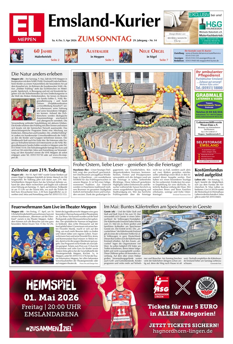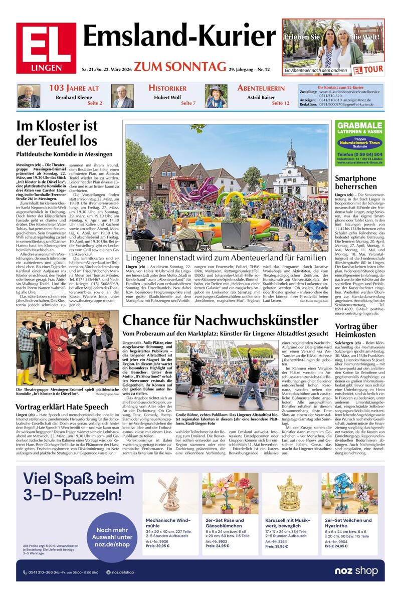 Aktuelle Ausgabe hier online lesen Emsland-Kurier Lingen 11.04.2026 Emsland-Kurier - Meppen 11.04.2026 Emsland-Kurier Papenburg 11.04.2026 Aktuelle Prospekte und Beilagen